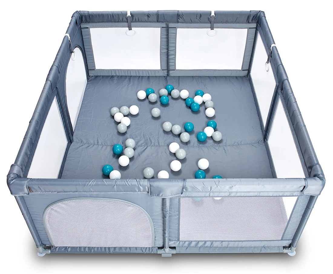 De ballenbak heeft mesh-stof zijkanten, zodat je je kindje altijd goed in de gaten kan houden. Hij is 150 bij 180 cm groot, genoeg speelruimte dus! De 48 meegeleverde gekleurde ballen maken het helemaal af. Uiteraard ook zonder ballen te gebruiken, zo creรซer je een veilig plekje om te spelen of te liggen.ย