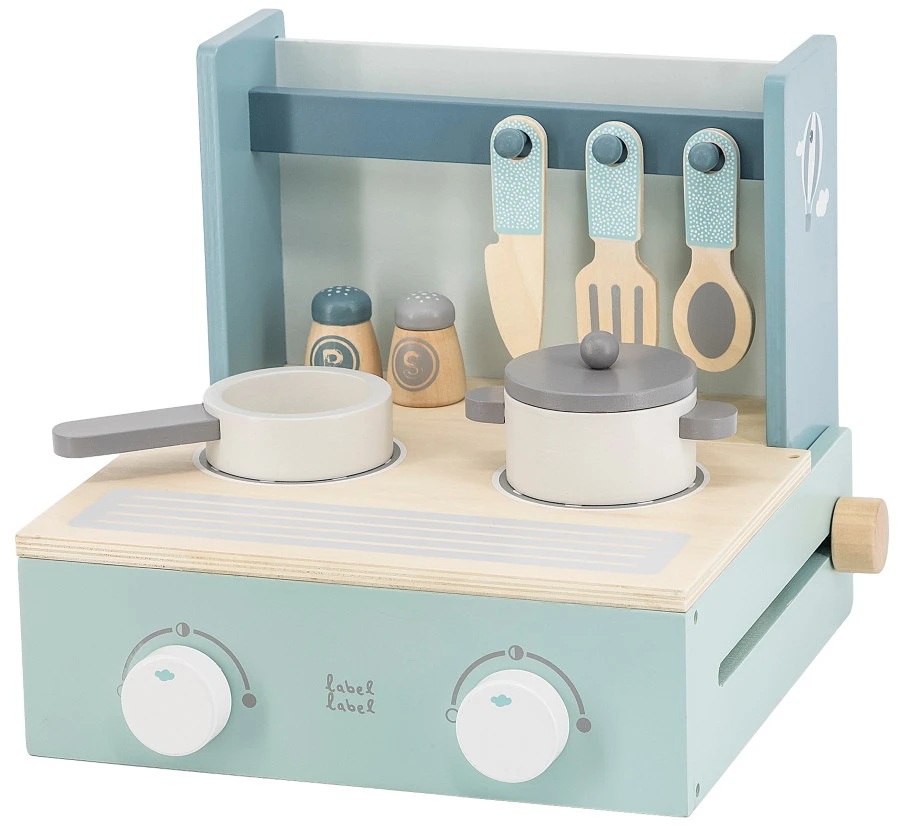 Je kleine zal zich een ware chef voelen als hij/zij aan het koken is op dit houten kookstel van Label Label! Deze compacte set heeft 2 kookpitten met draaiknoppen om ze in te stellen. Daarnaast is de set uitgerust met een steelpannetje, pannetje, peper- en zoutstel, een mes, spatel en een opscheplepel.
