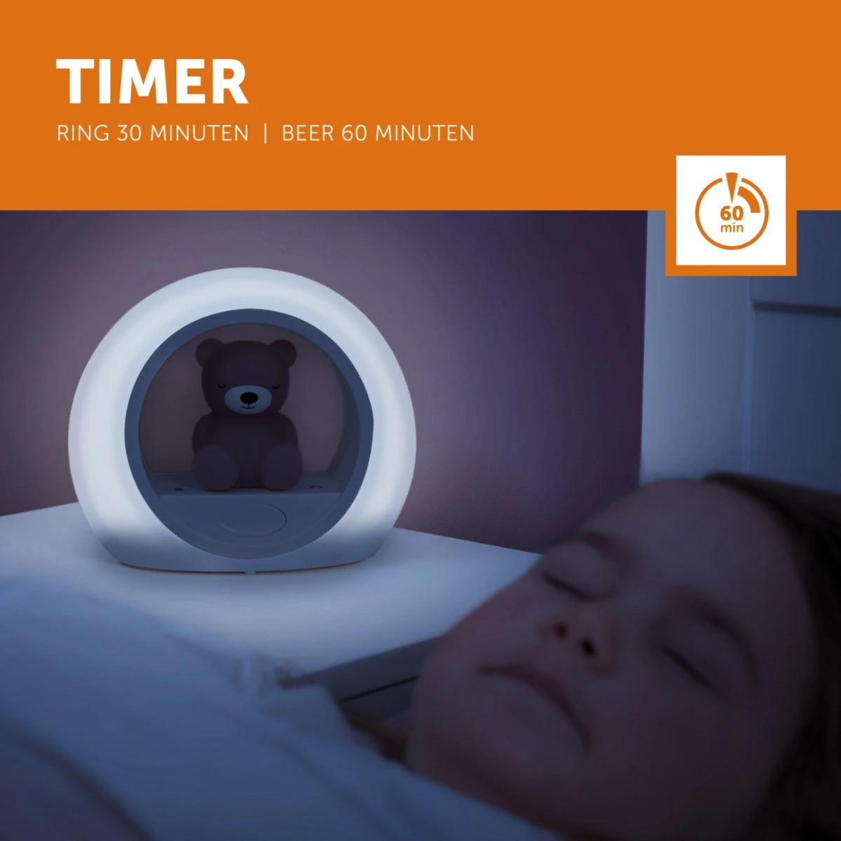 De geluidssensor zorgt ervoor dat wanneer je kleintje ’s nachts huilt, het beertje automatisch even aangaat zodat je kindje kan zien dat er niets aan de hand is en hij/zij nog steeds veilig thuis is. Als de rust weer terug is schakelt Billy zichzelf weer uit. Met de timer functie kun je instellen dat de ring rondom Billy na 30 minuten uitgaat en Billy zelf na 60 minuten. Ook de felheid is aan te passen zodat je hem tijdens het naar bed gaan lekker fel kunt zetten. Gaat je kleine slapen? Dan kan je het lichtje gemakkelijk dimmen.