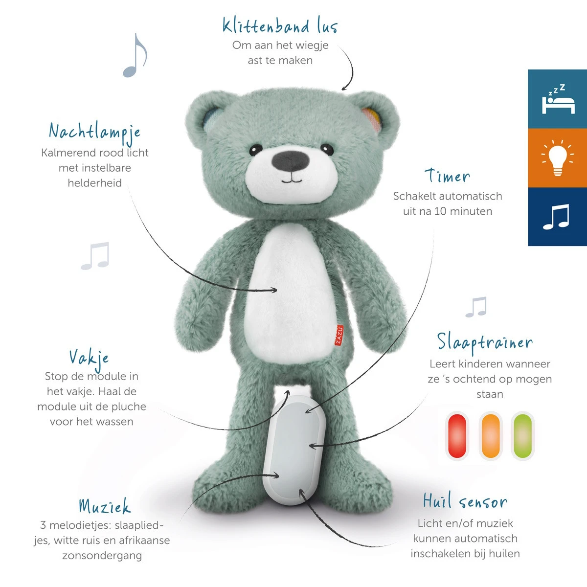 Naast licht geven, is Zazu Brody ook erg muzikaal! Je kunt namelijk uit drie muziekmodi kiezen: slaapliedjes, witte ruis, of het prettige geluid van een Afrikaanse zonsondergang. Ook is Brody voorzien van een handige huilsensor. Wanneer je kindje wakker wordt kan de beer troost bieden door zijn buikje op te lichten en muziek af te spelen. Na tien minuutjes stopt hij vanzelf weer.
