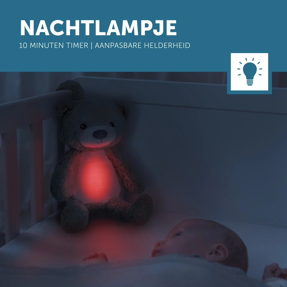 - Keuze uit 3 geluidsmodi: witte ruis, slaapliedjes, Afrikaanse zonsondergang